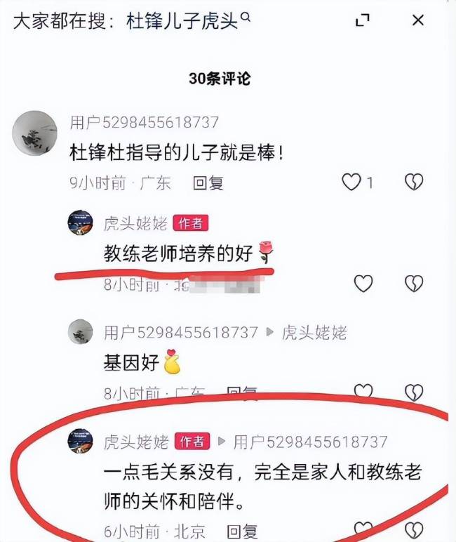 然而,在网友称赞虎头时,杜锋的前丈母娘却上线回应称:“是教练老师培养的好。”有网友再次留言说:“(虎头)基因好。”但前丈母娘依然表示:“一毛关系没有,完全是家人和教练老师的关怀和陪伴。”